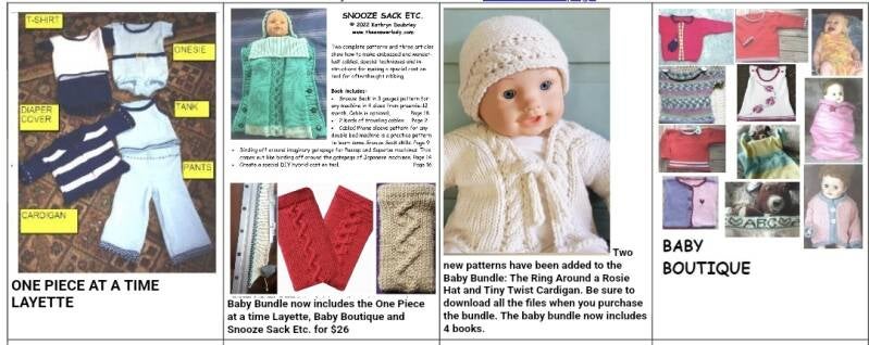 All of my baby patterns are now bundled into one big book. It consists of those things pictured and described below. The girl patterns are also bundled into one big book.